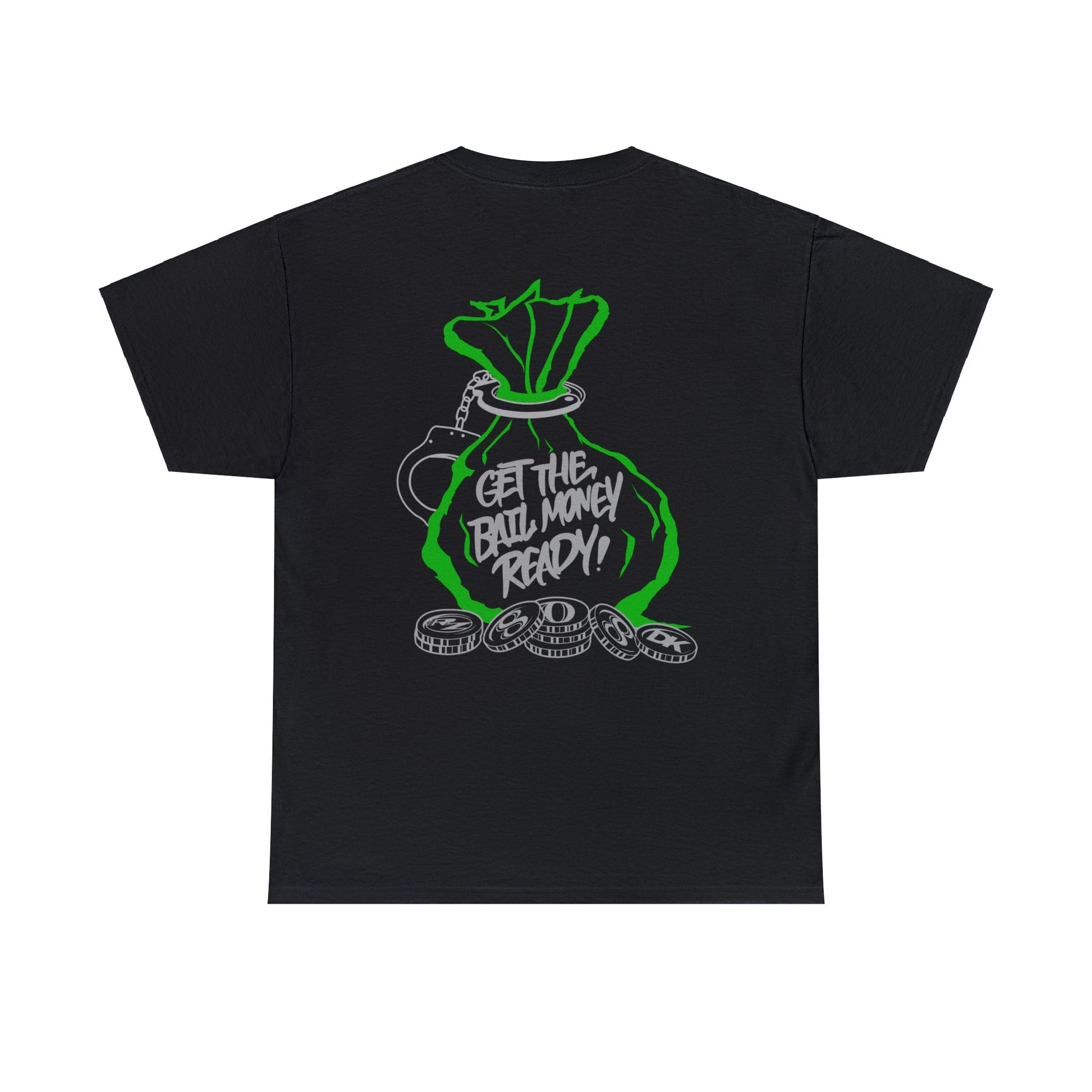 Back Design: The back of this tee showcases a vibrant green money bag adorned with handcuffs, embodying the motto "get the bail money ready" – a rallying cry for unforgettable nights on the streets. The bag is accentuated with coins, including the iconic RZ and DK emblazoned on them. This visual masterpiece captures the essence of the street culture and the bond shared within the RZxDK family.
